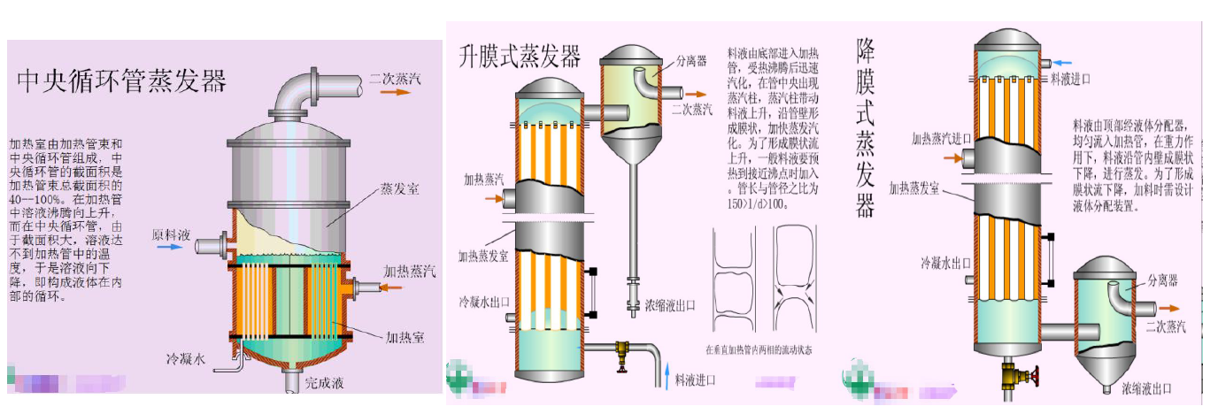 经常有听到升膜、降膜蒸发浓缩器,它们的主要区别在于,物料进入加热管并在管壁上形成薄膜,这个过程上升还是下降的问题。有些系统里面,其一个加热器里就兼有升降膜。