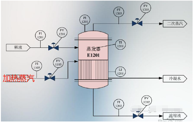A、稀液的气动控制阀(FV1201)---蒸发器液位和稀液流量串级控制;
